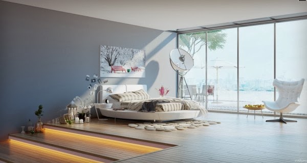3. Tempat tidur yang ditaruh di atas sebuah platform tempat tidur. Dengan kurangnya rak dan furnitur yang berlebihan membuat jauh lebih mudah hanyut dalam mimpi yang damai. Lalu dengan adanya pintu geser terbuka keteras untuk ngopi , membuat mereka berkenan untuk terbangun.